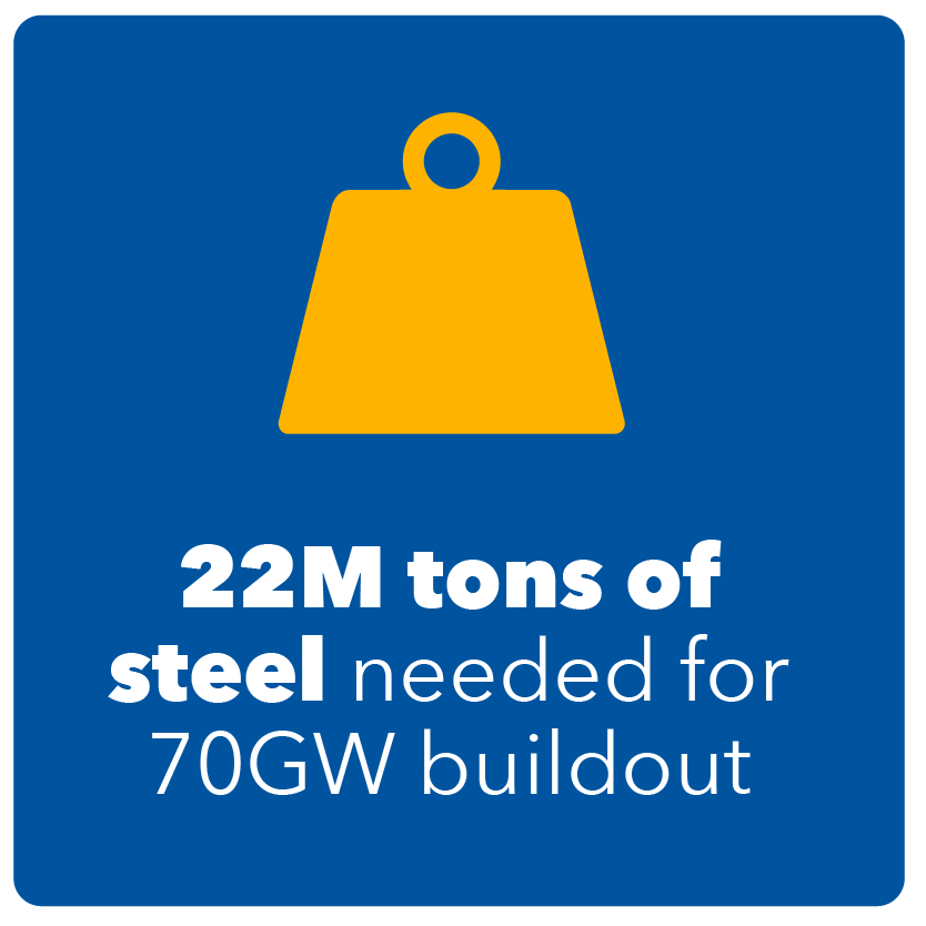 Building the 70GW of offshore wind projects already leased or proposed in the United States will require approximately 22 million tons of steel over the next two decades.